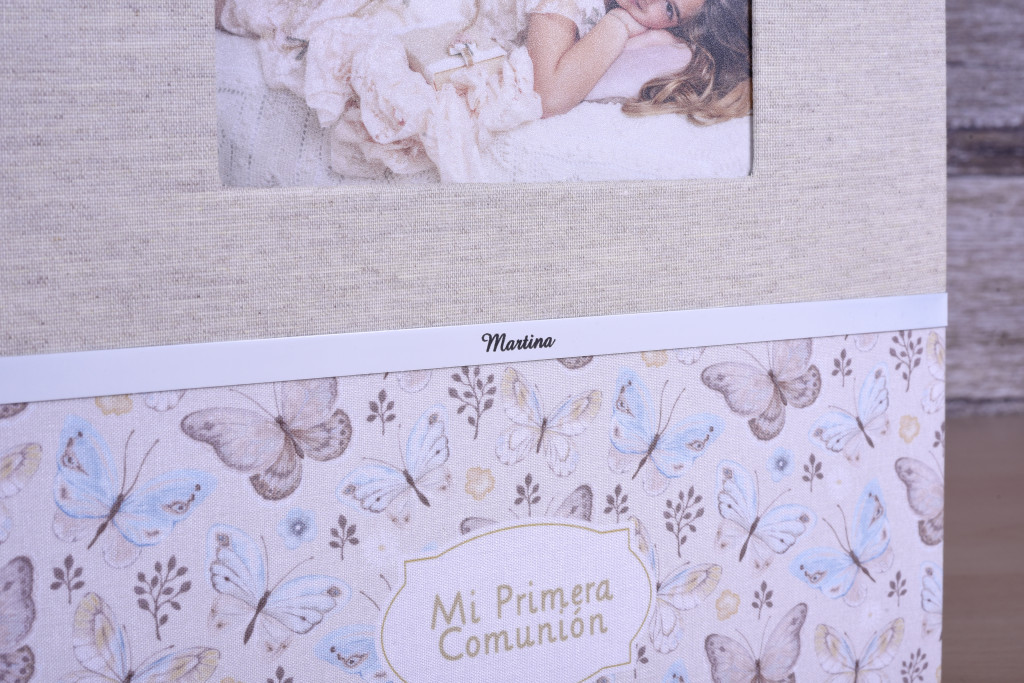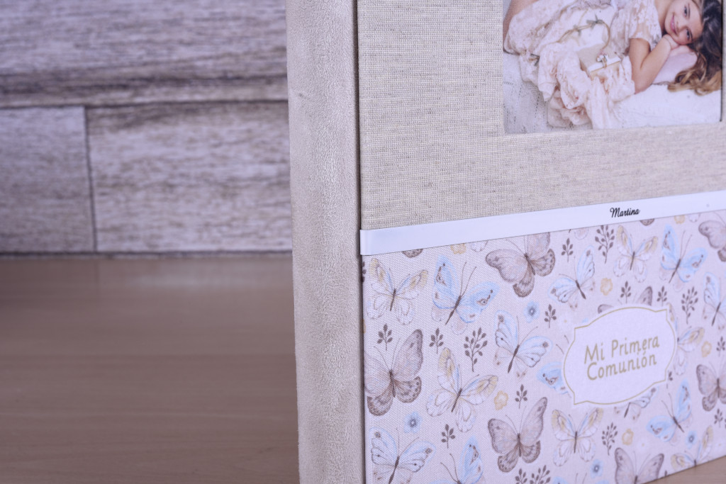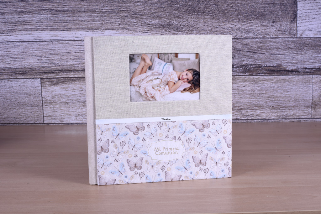 Posibilidad de hacer este diseño en cuatro opciones: con ventana y tira de terciopelo, con ventana y tira metálica, con foto superior horizontal y tira de terciopelo o con foto superior horizontal y tira metálica.