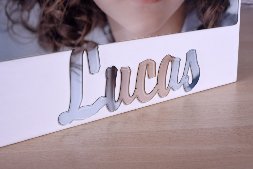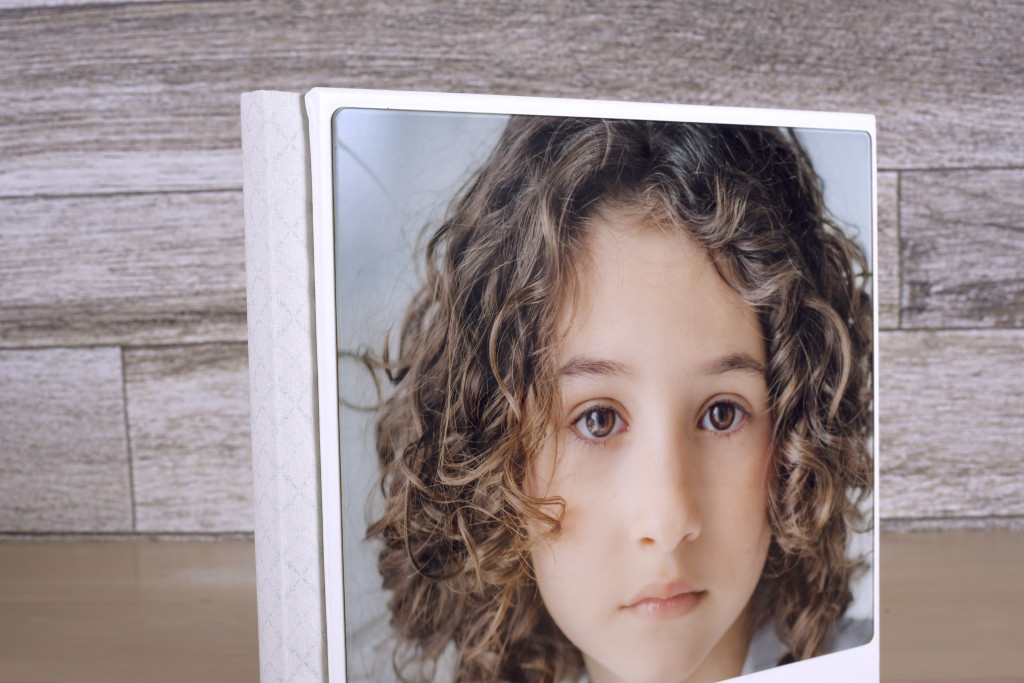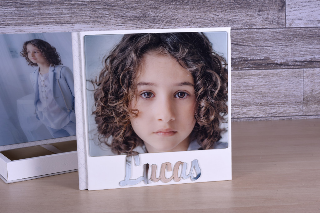 Portada con polipiel blanca y metacrilato brillo efecto espejo. Trasera con material escogido.