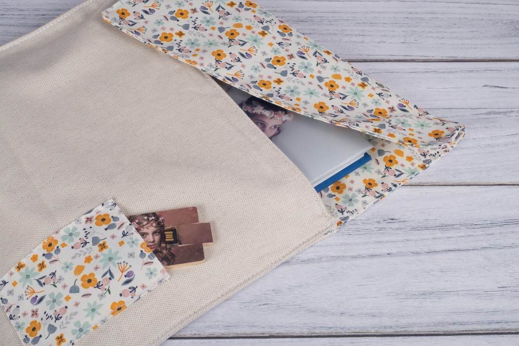 Una fundita de tela hecha a medida y cosida con hilos resistentes y suaves, con solapa superior y cierre. Fabricamos el cuerpo de la bolsa en un lino beige resistente y la solapa en el material que nos digas. Existe posibilidad de añadir bolsillo a juego de la solapa si nos lo especificas a la hora de hacer pedido. Posibilidad de fabricarla también en polipiel. Usb impreso en UVI.