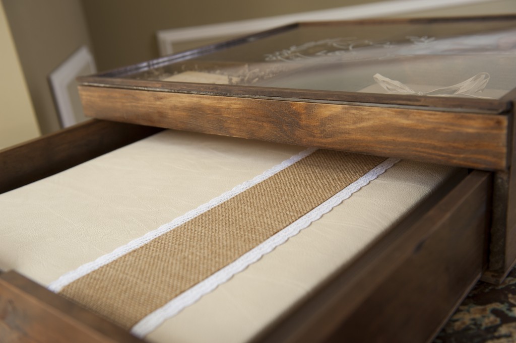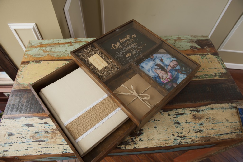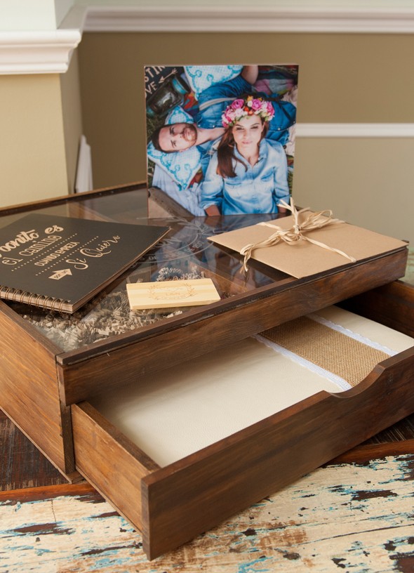 Una caja especial de madera de pino dividia en dos pisos, barnizada y protegida en color caoba, con tapa corredera transparente y posibilidad de grabar la misma.