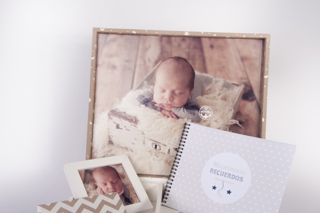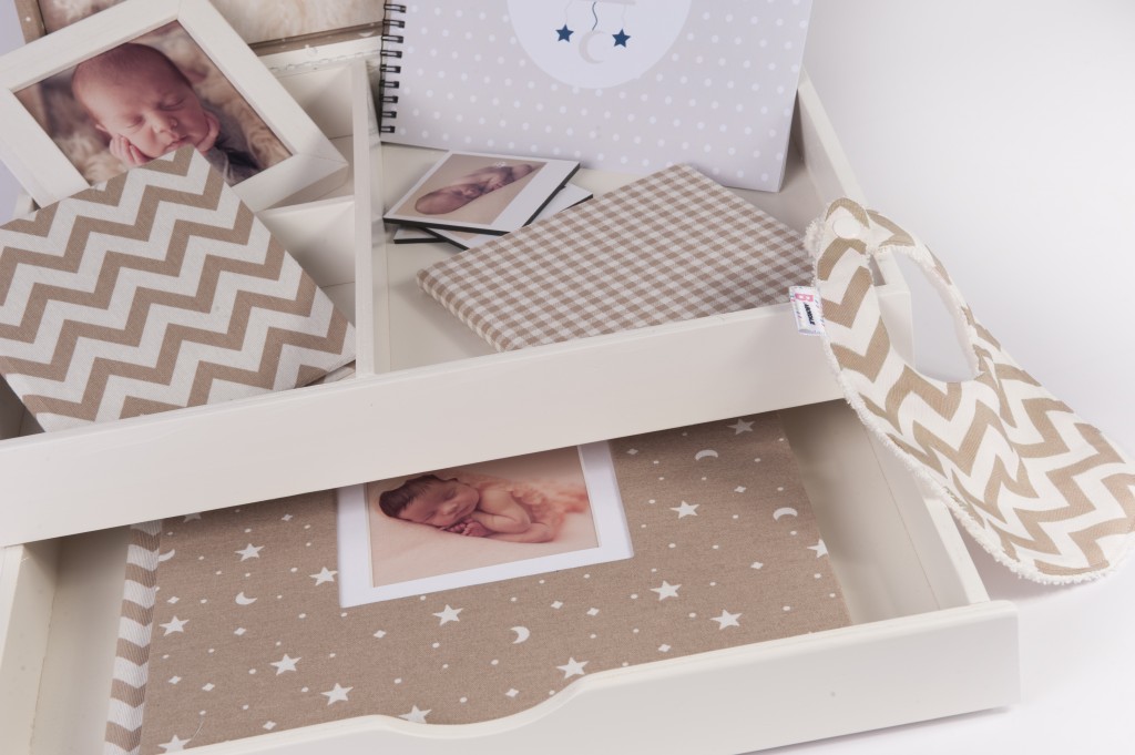 Todo esto guardado en un cofre de color blanco con la portada forrada a juego del álbum en cualquiera de las doce telas de la Colección Baby y con fotografía interior.